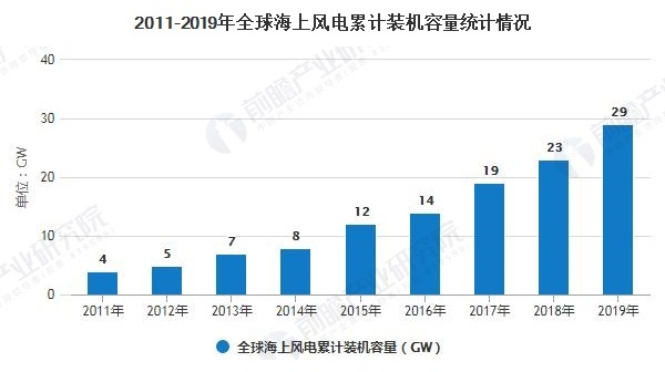 海上風電的優勢主要是風速較陸上更大,風垂直切變更小,湍流強度小,有穩定的信號主導方向,年利用小時長。此外,海上風電不占用土地資源,且接近沿海用電負荷中心,就地消納避免了遠距離輸電造成的資源浪費。根據GWEC的統計,2019年全球海上風電新增裝機創歷史新高,首次突破6GW,目前全球海上風電總裝機量超過29GW。