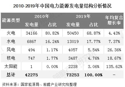 從中國近年來的電力能源看,風電已經成為僅次于火電和水電的第三大電力來源。2019年風電發電量為4057億千瓦時,占全國發電量的5.54%。2010年和2019年中國風電來源構成如下:
