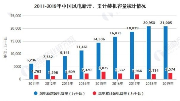 從新增裝機容量來看,2019年,全國風電新增并網裝機2574萬千瓦,其中陸上風電新增裝機2376萬千瓦、海上風電新增裝機198萬千瓦。