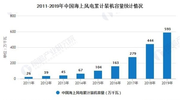 與全球風電行業發展趨勢保持一致,在中國風電行業整體快速發展的情況下,海上風電發展速度快于風電行業整體發展速度。截至2019年底,海上風電累計裝機容量593萬千瓦。