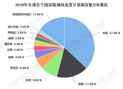 目前,全球已有90多個國家建設了風電項目,主要集中在亞洲、歐洲、美洲。從各國分布來了看,截至2019年底,中國、美國、印度、西班牙和瑞典為全球陸地風電累計裝機容量排名前五的國家,陸地風電累計裝機容量占全球陸地風電裝機容量的37%、17%、6%和4%,合計占比為73%。