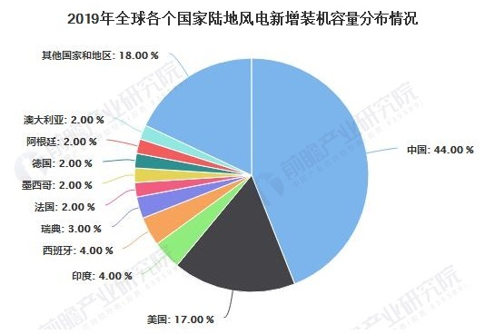 從新增裝機容量來看,2019年,全球陸地新增裝機容量排名前五的國家為中國、美國、印度、西班牙和瑞典。陸地新增裝機容量占2019年全球陸地風電新增裝機容量的比例分別為44%、17%、4%、4%和3%,合計占比為72%。