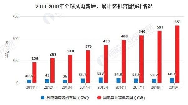 風力發電是可再生能源領域中最成熟、最具規模開發條件和商業化發展前景的發電方式之一,且可利用的風能在全球范圍內分布廣泛、儲量巨大。同時,隨著風電相關技術不斷成熟、設備不斷升級,全球風力發電行業高速發展。根據GWEC的統計,截至2019年底,全球風電累計裝機容量為651GW,較2001年底增長超過26倍,年均復合增長率為20.12%。